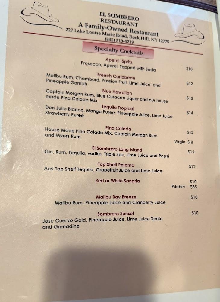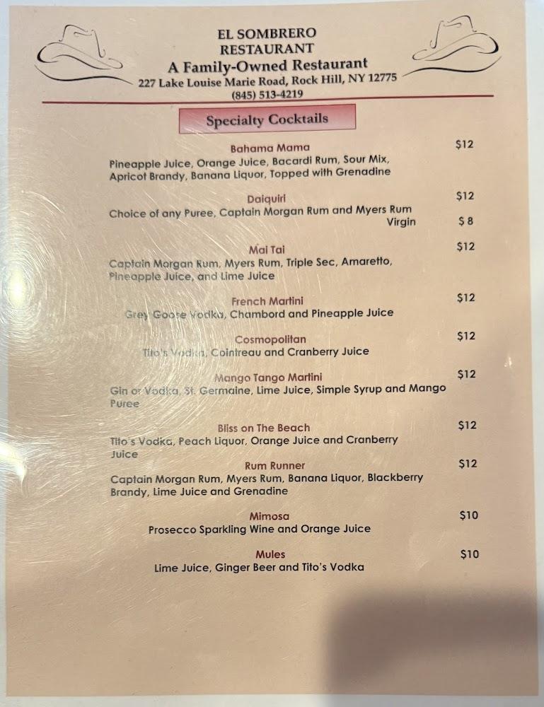 Welcome to El Sombrero Restaurant Tex Mex Bar & Grill, where the vibrant flavors of Mexico come alive in a warm and inviting atmosphere! Located at 227 Lake Louise Marie Rd, Rock Hill, NY, we take pride in being a Latino-owned establishment that prioritizes your enjoyment. Our diverse menu features delicious Tex-Mex classics, excellent cocktails, and an array of local specialties, available for dine-in, takeout, or delivery. Join us for lunch or dinner on our beautiful terrace, and don't miss our happy hour specials. Experience the perfect blend of great food, quick service, and a lively ambiance at El Sombrero!
